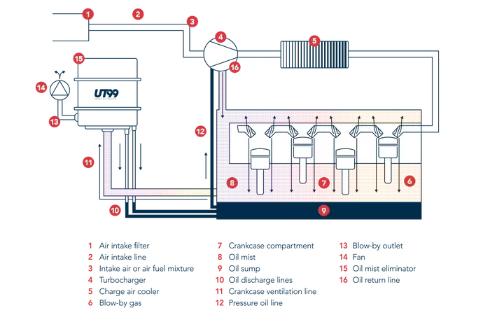 When an engine is running, an oil mist forms in the crankcase. This mist has to be separated before it enters the atmosphere or the engine intake tract. Crankcase ventilation systems are a basic feature of internal combustion engines. Their purpose is to separate the oil mist and return it to the oil pan. They therefore play a significant role in reducing oil consumption and particle emissions, and thus contribute towards achieving compliance with the EU, EPA (e.g., Tier 4), and IMO threshold values for PM emissions. Such systems also regulate the pressure in the crankcase to prevent leaks and reduce gasket wear. This is of vital importance when using toxic fuels such as ammonia or methanol.